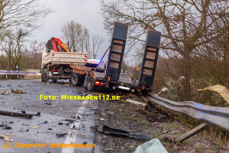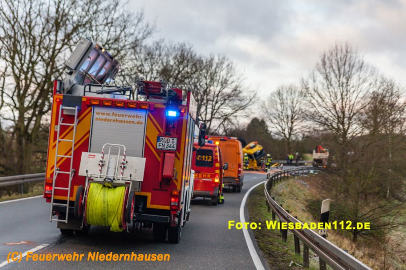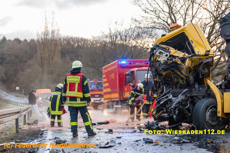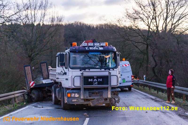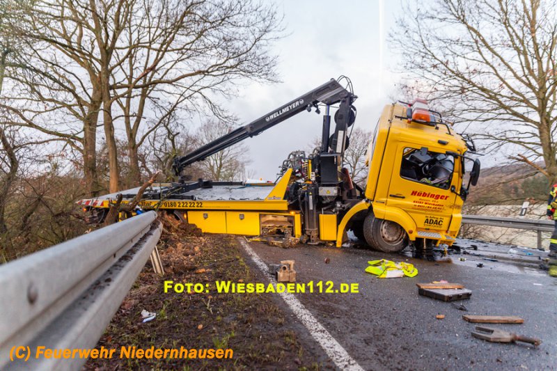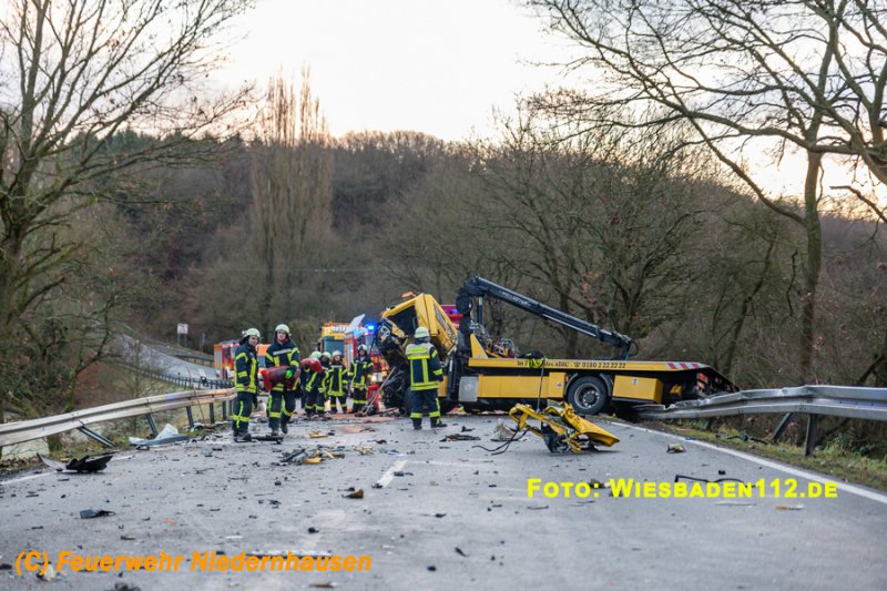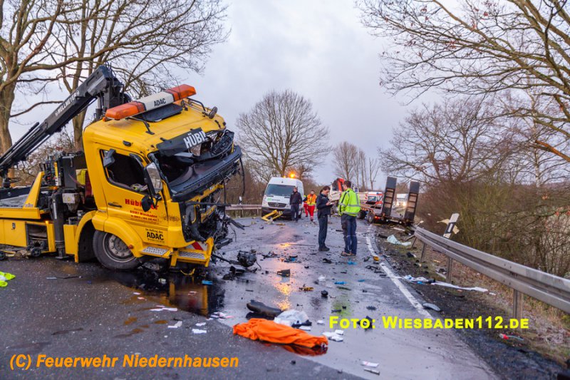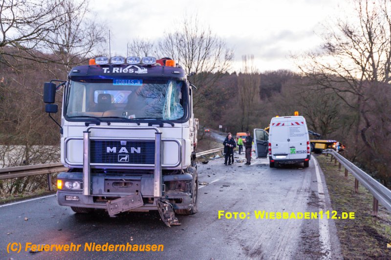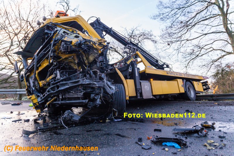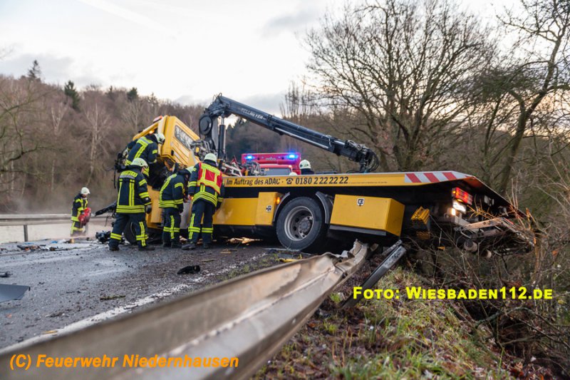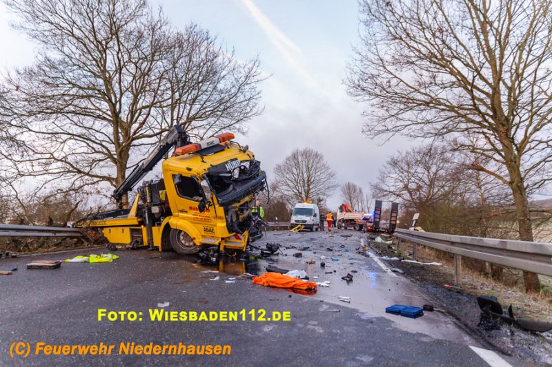 Aufgrund von Glätte kam es zu einem schweren LKW Unfall an dem 2 LKW, 1 Kleintransporter sowie 2 PKW beteiligt waren. Bei dem einen LKW handelte es sich um ein Abschleppfahrzeug, welches zu einem verunfallten PKW gerufen wurde. Dieses Fahrzeug kam vermutlich auf der abschüssigen und vereisten Fahrbahn ins schleudern und kollidierte mit einem entgegenkommenden LKW. Zeugen berichteten, dass der Fahrer des Abschleppwagens vor seinem Fahrzeug lag, so dass davon auszugehen ist, dass er aus dem Fahrzeug geschleudert wurde. Die Feuerwehr sicherte die Einsatzstelle und streute großflächig mit Ölbindemittel die auslaufenden Betriebsstoffe ab.