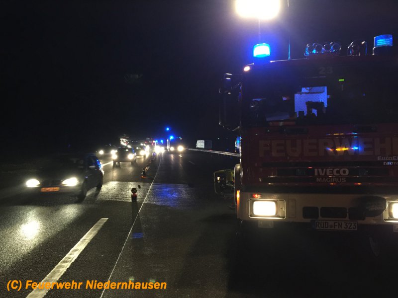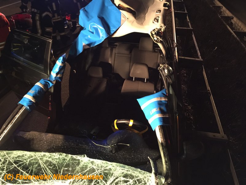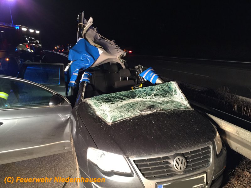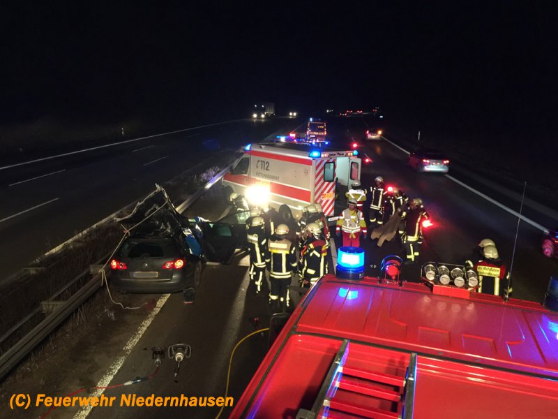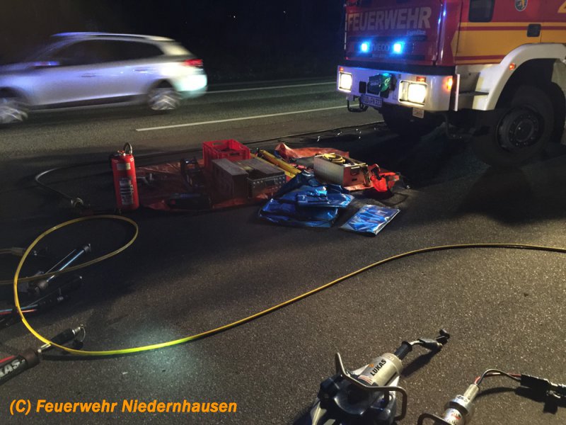 Ein Autofahrer war in seinem Fahrzeug eingeklemmt worden, nachdem er mit einem LKW Reifen kollidierte. Der LKW Reifen war an einem LKW, der die Autobahn Richtung Frankfurt befuhr,abgerissen und auf die Gegenfahrbahn geflogen. Dort kollidierte der Reifen samt Felge mit dem Fahrzeug des eingeklemmten Fahrers. Die Frontscheibe, sowie das gesamte Dach, waren stark eingedrückt. Glückerweise konnte der Fahrer sein Fahrzeug noch an der Mittelleitplanke zum Stehen bringen. Die Feuerwehr entfernte, in Absprache mit dem Notarzt, das Dach des Fahrzeuges um den Patienten möglichst schonend aus dem Fahrzeug retten zu können.