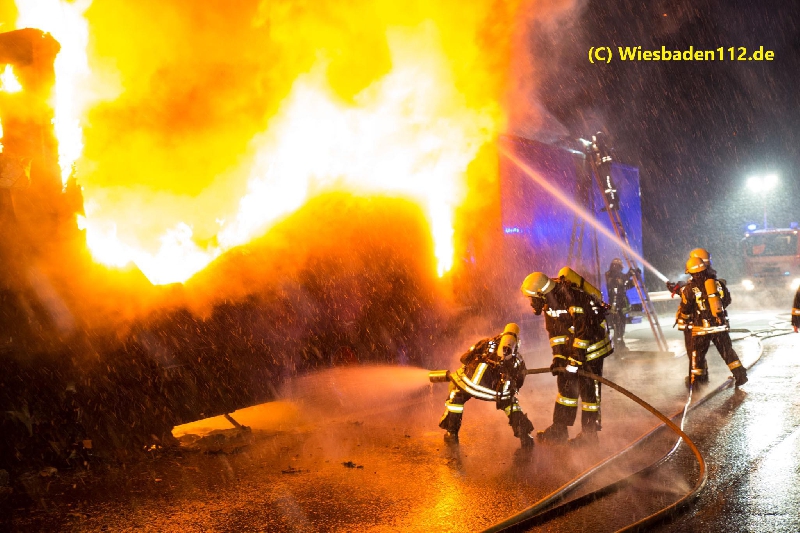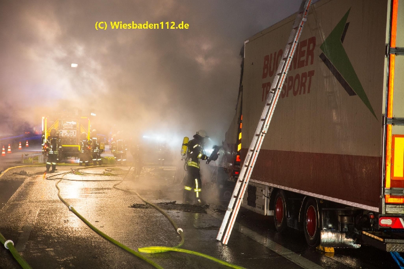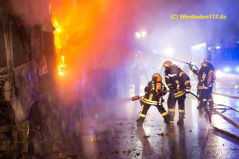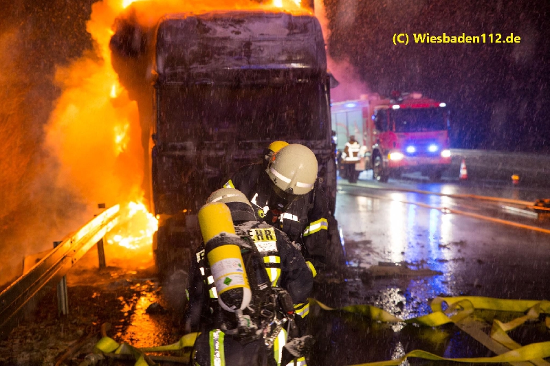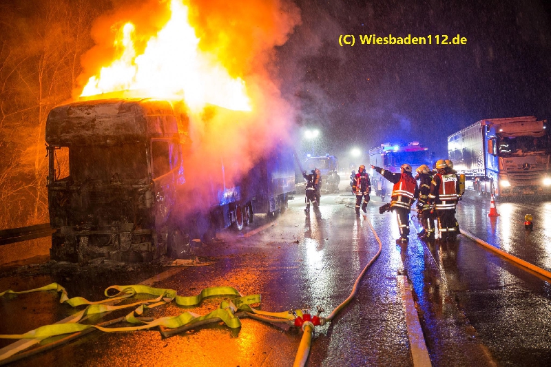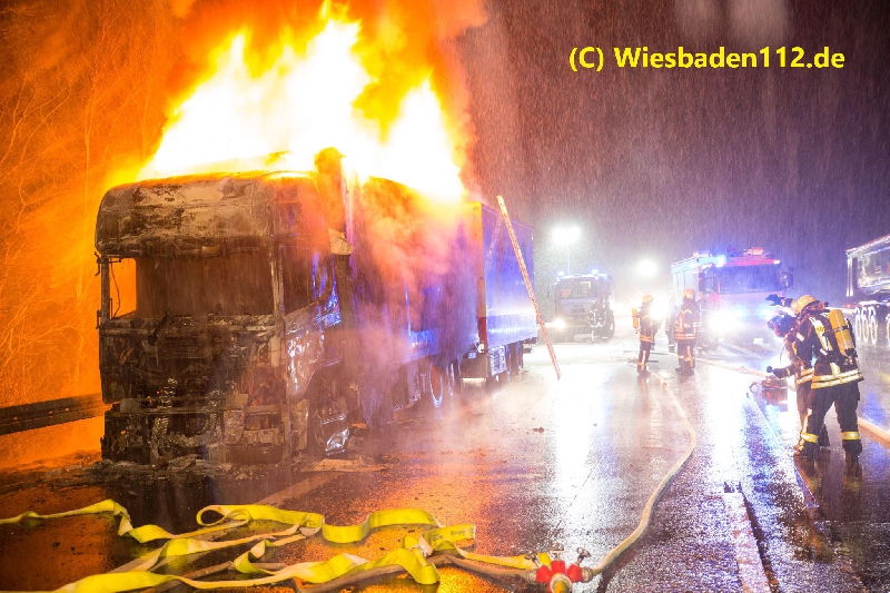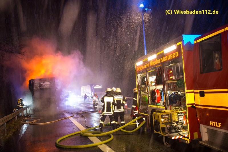 Beim Eintreffen des ersten Fahrzeugs stand das Fahrerhaus in Vollbrand. Das Feuer breitete sich sehr schnell auf den Aufbau, der mit Kunststoffkisten beladen war, aus. Zur Brandbekämpfung wurden zwei C-Rohre, eine C-Schaumpistole, ein B-Mittelschaumrohr, 13 Pressluftatmer und eine Wassermenge von ca. 30.000 Liter eingesetzt. Die Wasserversorgung wurde durch einen Pendelverkehr der Fahrzeuge aus Idstein (GTLF), Wiesbaden (GTLF), Königshofen (LF) und Niedernhausen (LF) sicher gestellt.